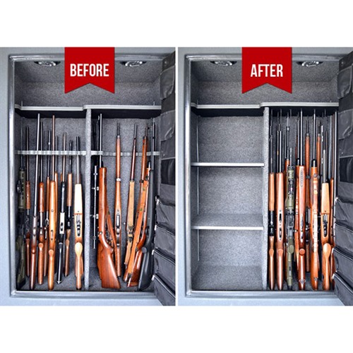 GUN STORAGE SOLUTIONS ha creado los Rifle Rods, fabricados en EE. UU., que estabilizan cada rifle en posición vertical, en lugar de estar inclinados, para ofrecerte más versatilidad. El tejido de bucle incluido en los Rifle Rod Kits se adapta a cualquier espacio: caja fuerte, armario o gabinete, forrando la parte inferior de una estantería de madera.