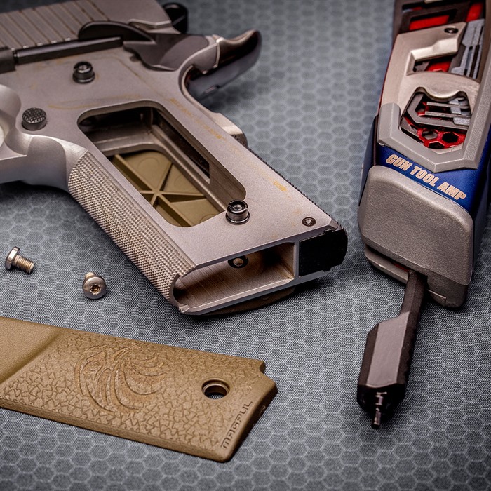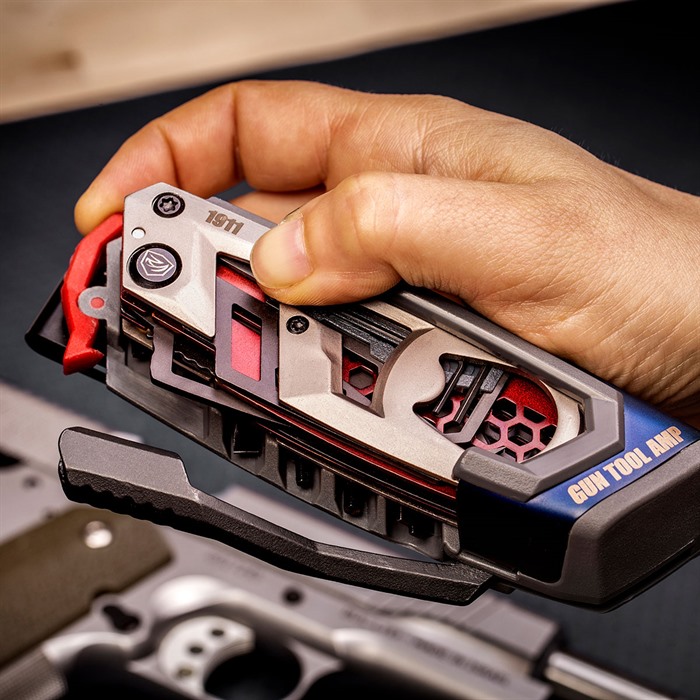 Real Avid’s Gun Tool AMP series is a new generation of platform-specific multitools. Re-imagined with transformer-like, self-storing capability, where the dual-purpose driver and bit set serve as a holster for the tool frame, encompassing the critical gun tool implements. AMP series tools redefines what a carry tool can be by delivering on mission critical solutions while eliminating excess bulk. Specialized for the 1911 platform includes both Government and Officer barrel bushing wrenches and full array of 1911 related bits and implements. Punches, picks, scrapers, wrenches and an innovative hex key storage feature in a compact kit that can go anywhere you do.Features: - EDC, specialized gun multi-tool - Transformer design, packed with mission critical capability - Quick deploy holster carries the multi-tool, houses the bits and features a fold-out locking driver - Platform-specific tools and implements, essential for 1911 pistols - Premium titanium & black oxide finishes - Stainless steel tools are easy to access and securely lock in place - 1911 bushing wrench for government and officer profiles - Included tools: pin punch, flat carbon scraper, metal file, pick, nut wrenches (4mm, 5mm,1/4”, 5/16”), 2.6” drop point knife blade, tap hammer, laser sight and trigger adjustment hex keys (.028”, .035”, .050”, 1/16”).