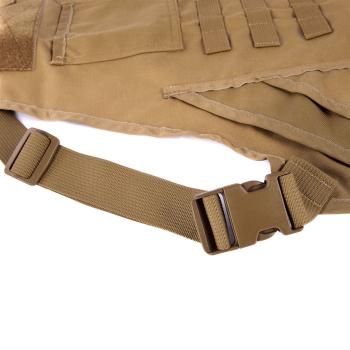 - Incluye cuatro bolsillos laterales y un bolsillo en el pecho con múltiples secciones, completo con un campo de gancho y bucle que acepta parches.