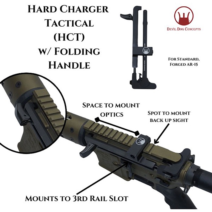 DEVIL DOG CONCEPTS HARD CHARGER TACTICAL SIDE-CHARGING HANDLE W/FOLDING HANDLE FOR AR-15 Hard Charger® Tactical with Folding Handle - for Standard Forged, Mil-Spec AR-15/M4 Rifles No longer do you have to rebuild your upper receiver or buy a new rifle to have the side charging capability!! Turn your rifle in to a Side Charger without having to rebuild or modify it. Simply swap out the charging handle and install the Hard Charger. Takes a minute or less and you are up and running! FEATURES Devil Dog Concepts’ Side Charging Handle System = Ergonomically Beneficial Multiple Ways to Charge Interchangeable from Rifle to Rifle Non Reciprocating Removes Stress on Roll Pin Reduces Torque on Charging Handle Field Strippable – Gross Motor Skills Plenty of Room for Mounting Optics and Sights The HCT (Hard Charger® Tactical) Mounts to the 3rd Picatinny Rail and is designed to work on Standard, Forged, Mil-Spec Type Upper Receivers. This design mounts between a Back Up Sight and a forward mounted Optic. Not designed for Billet Rifles including Aero M4E1 SPECS For Standard, Forged Flat Top AR-15s Made from 7075 Aluminum Anodized Black, and Steel Weighs 6oz 5 year manufacturer warranty. U.S. Patent No. 9,746,263 U.S. Trademark Reg. No. 5,354,510