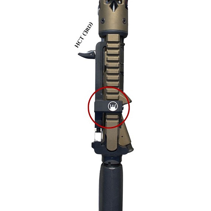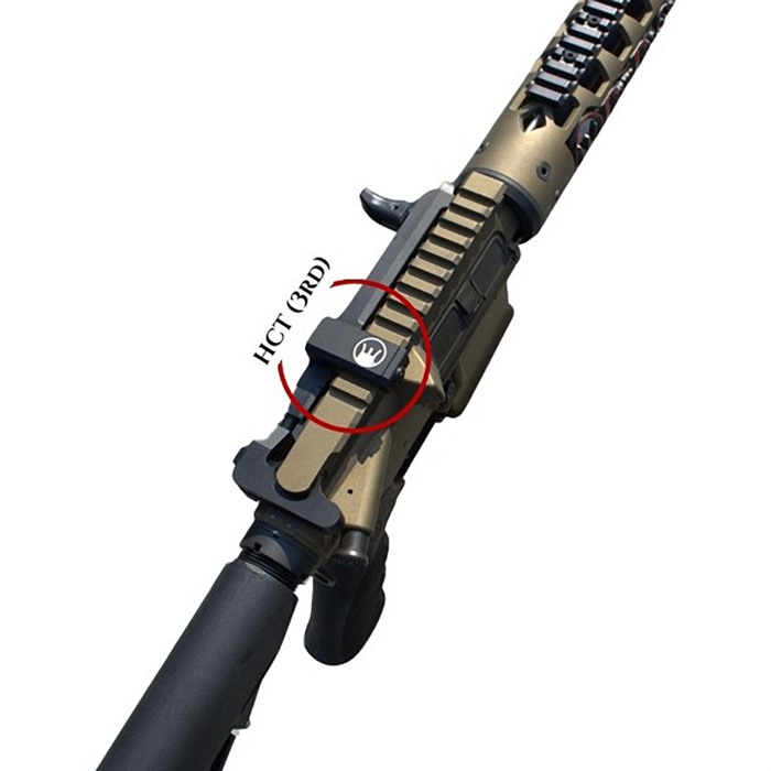 El HCT (Hard Charger® Táctico) se monta en el tercer riel Picatinny y está diseñado para funcionar en receptores superiores estándar, forjados y de tipo Mil-Spec. Este diseño se coloca entre una mira de respaldo y un óptico montado hacia adelante.