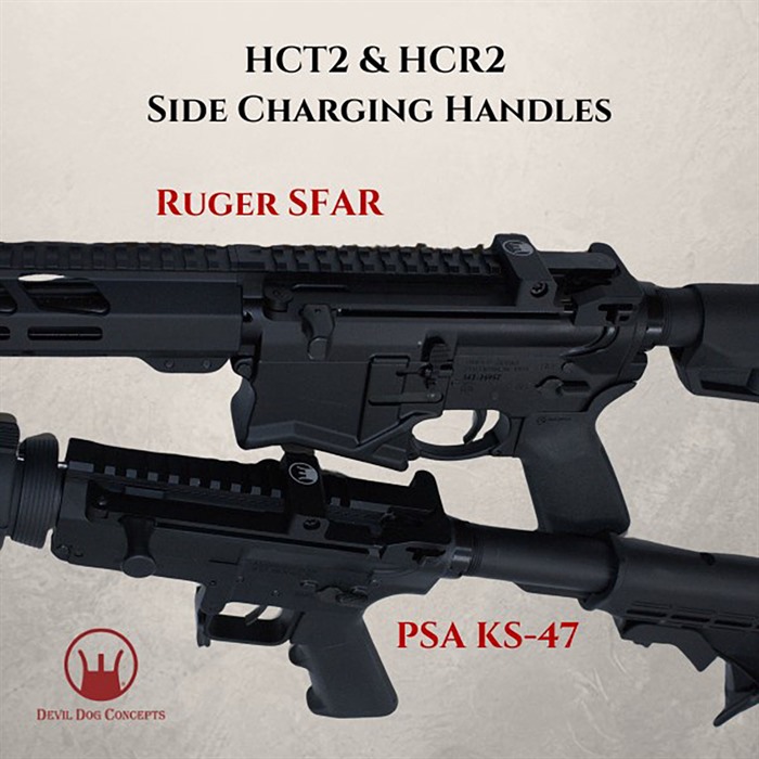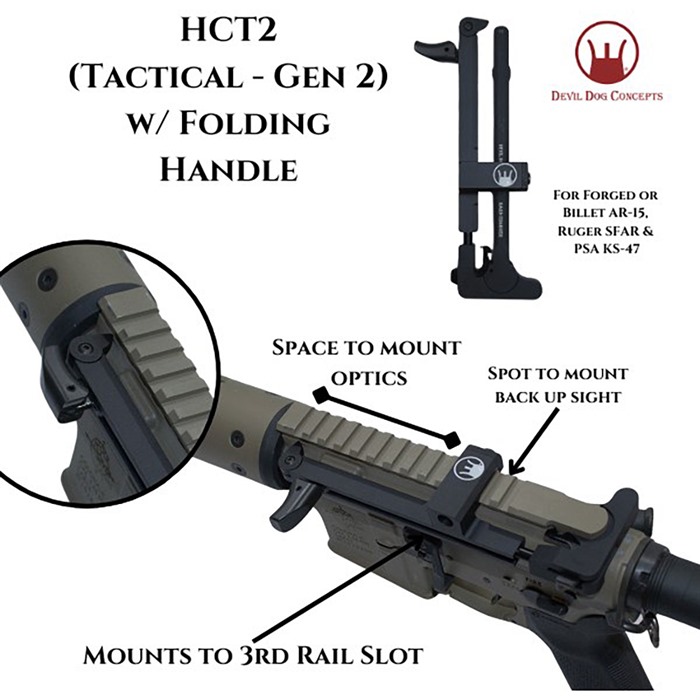 DEVIL DOG CONCPETS HCT2 G2 HARD CHARGER TACTICAL SIDE-CHARGE HANDLE W/FOLD HANDLE FOR AR-15 HCT2 (Hard Charger® Tactical – Gen 2) with Folding Handle: for AR-15 Forged/Billet, SFAR & KS-47 No longer do you have to rebuild your upper receiver or buy a new rifle to have the side charging capability!! Turn your rifle in to a Side Charger without having to rebuild or modify it. Simply swap out the charging handle and install the Hard Charger. Takes a minute or less and you are up and running! FEATURES Devil Dog Concepts’ Side Charging Handle System = Ergonomically Beneficial Multiple Ways to Charge Interchangeable from Rifle to Rifle Non Reciprocating Removes Stress on Roll Pin Reduces Torque on Charging Handle Field Strippable – Gross Motor Skills Plenty of Room for Mounting Optics and Sights The HCT2 (Hard Charger® Tactical Gen 2) Mounts to the 3rd Picatinny Rail. This new model is designed to work on Standard, Forged, Mil-Spec Type Upper Receivers & Billet Rifles. Will also work on Ruger SFAR & PSA KS-47 This design mounts between a Back Up Sight and a forward mounted Optic. The adjustable tip allows for mounting on varying width Billet Receivers as well as the Ruger SFAR and PSA KS-47. SPECS For Forged & Billet AR-15s, and also Ruger SFAR & PSA KS-47 Made from 7075 Aluminum Anodized Black, and Steel Weighs 6oz 5 year manufacturer warranty. U.S. Patent No. 9,746,263 U.S. Trademark Reg. No. 5,354,510 Not designed for Aero M4E1