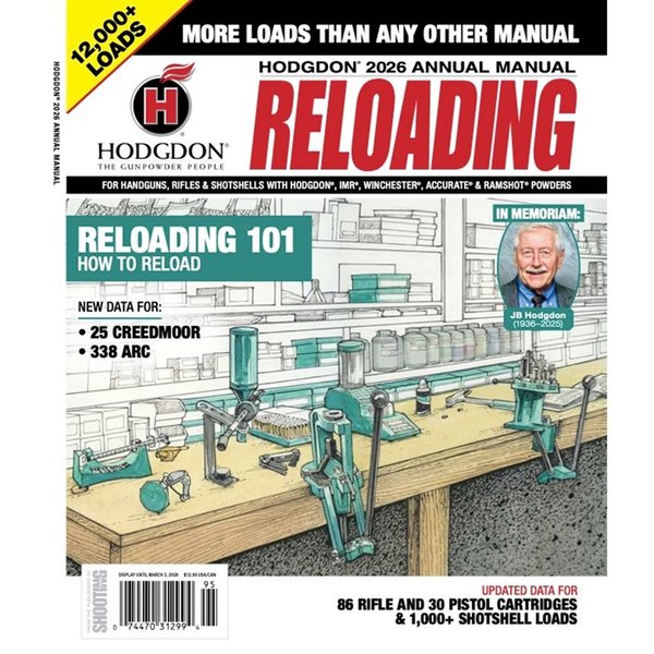El 2026 HODGDON ANNUAL MANUAL de HODGDON POWDER CO., INC. es una herramienta imprescindible para cualquier aficionado a la recarga de municiones. Este manual no solo incluye datos de carga de Hodgdon, sino que también ofrece información sobre polvos IMR, Winchester, Ramshot y Accurate.