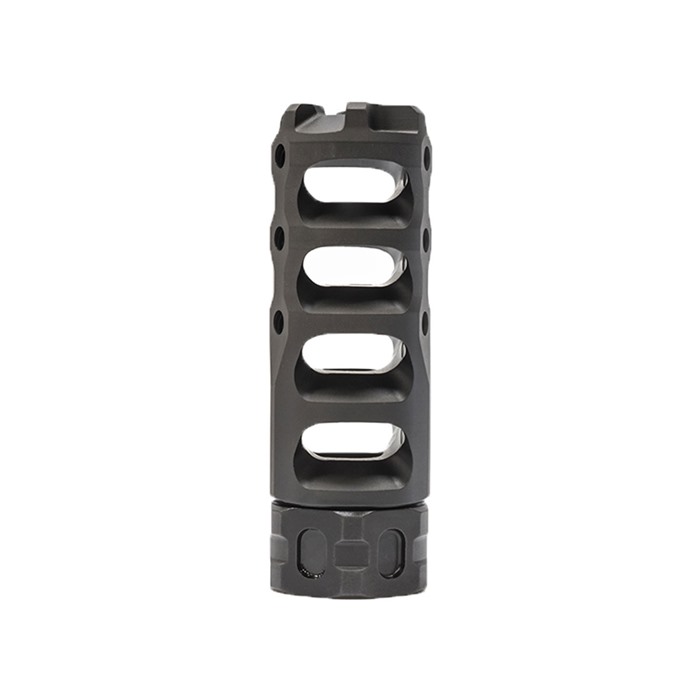 After spending years on the cutting edge of muzzle-brake design, Precision Armament developed its Hypertap Muzzle Brake in an effort to provide today's shooters with the best-possible brake design on the market today. This unique setup combines proprietary technology with user-adjustable features in a blend of upper-echelon technology and simplicity. The tech involved in the design of the Precision Armament Hypertap Muzzle Brake focused on the company's proprietary Convergent-Divergent port geometry, which reduces felt recoil by an incredible 84 percent. This improves on the company's earlier M4-72 design by almost 10 percent, all while preserving the 35-degree baffle angles and bore clearance found in the original design. These features are critical in ensuring that the device is safe for shooters and produces less gas blowback as well as improved accuracy and comfort. Designed for use on .223/5.56mm barrels Weight: 3 ounces Length: 2.54 inches One of the other standout features found in the Precision Armament Hypertap Muzzle Brake includes "tunable gas biasing." This means that users can adjust where excess gas vents from the device through the use of the company's universal timing nut, ensuring that their sight picture isn't disturbed by a column of hot gas with every shot.