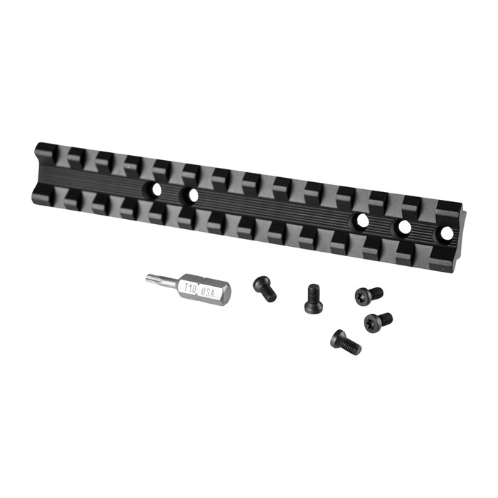 - Las ranuras transversales Picatinny recorren toda la longitud del riel, lo que proporciona flexibilidad al montar anillas de mira y otros accesorios.