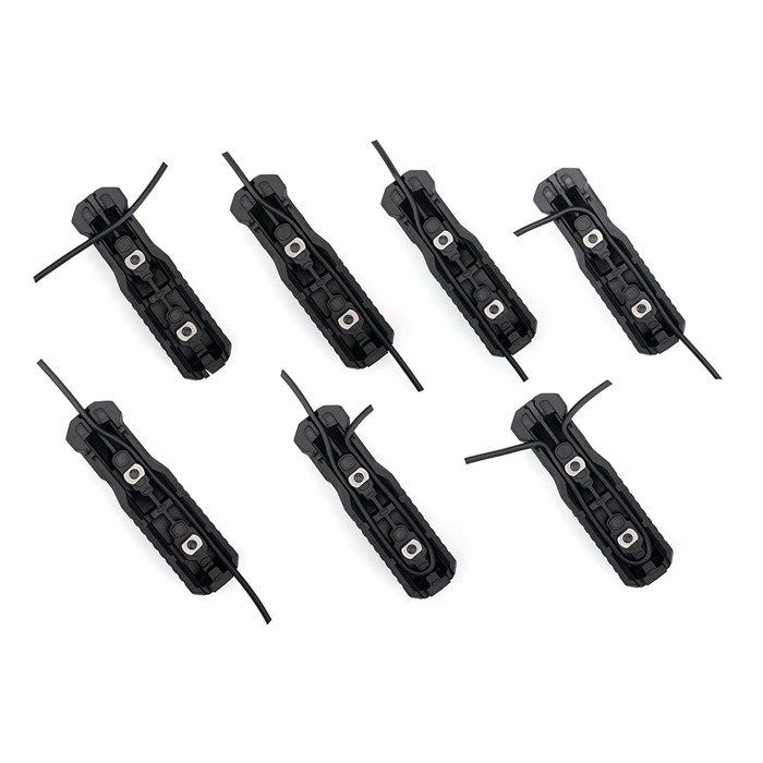 La singularidad de este accesorio de guardamanos no se detiene en la sujeción. También incluye la función SI Cable Management System® (CMS) en trámite de patente, que te permite organizar y almacenar el exceso de cable de tu luz de arma u otros accesorios con cable. Los cables pueden ser enrutados a lo largo del guardamanos, cruzados al otro lado, en un ángulo de 90 grados o en forma de U.