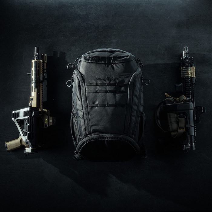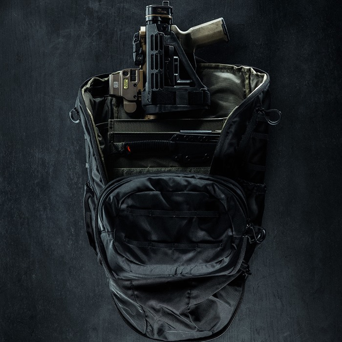 - Construcción: Cuenta con la tapa desplegable de la compañía, que permite un acceso total a cualquier pistola, rifle u otra arma larga almacenada en la mochila.
