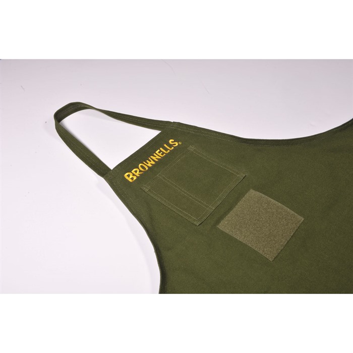 A Premium-Quality Shop Apron for Folks Who Work on Guns Brownells shop aprons have been a mainstay on the workbenches of both professional and hobbyist gunsmiths for decades. Our Long Shop Apron is excellent for all-around use and chores like painting and finishing. Any time there's a risk of getting dirt, debris, oil, or other gunk on your clothes, you'll want to wear this apron. It offers all the quality and features you expect from Brownells. The durable, all-cotton canvas construction stands up to the rigors of daily wear. Stitching is done with solvent- and oil-resistant nylon thread to ensure a long service life. All seams are double-stitched and rolled for extra strength, with every corner and stress point bar-tacked for reinforcement. This shop apron's length provides plenty of coverage to protect your clothes. Three (4) handy pockets on the front include a high centered upper pocket with a dedicated pen/pencil slot, plus spacious lower pockets on each side for additional storage. There's also a pocket on the inside at the top of the bib for holding your phone or other items you want at your fingertips. Rugged, long-lasting all-cotton canvas construction Strong double-stitched seams & reinforced stress points Four (4) handy pockets (3 outside, 1 inside) Easy-closure hook-and-loop neck strap for perfect fit Long length gives full coverage to protect your clothes The hook-and-loop closure on the neck strap lets you adjust the bib for a secure fit and maximum coverage. The Brownells logo is tastefully embroidered on the front to let the whole world know who your favorite firearm supplier is. The Long Shop Apron is easy to care for: when it gets dirty, just machine wash and dry it without worrying about the edges curling or the shape distorting. It'll stand up to many washing cycles, so you can always look clean and sharp for your customers. Grab one of these aprons today and protect your clothes from the little mishaps that can happen in the shop!
