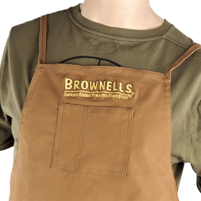 Consigue el delantal Brownells, duradero y cómodo, con bolsillos prácticos y fácil de lavar, perfecto para proteger tu ropa en el taller.