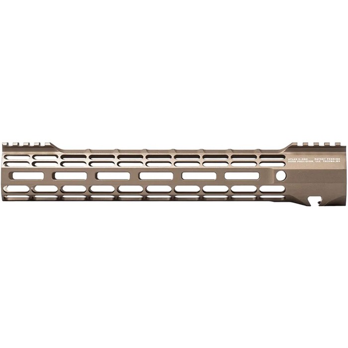 The ATLAS S-ONE is the newest addition to the Aero Precision Handguard lineup. Machined from 6061-T6 Aluminum, the S-ONE line of handguards are designed with size and weight in mind, providing the perfect handguard for your lightweight build. Aero's proprietary ATLAS attachment system is a durable and dependable mounting platform, maintaining a slim profile while still providing the strength and stability customers have grown to love from Aero Precision handguards. ATLAS The new Aero Taper Lock Attachment System (ATLAS) is both functional and aesthetically pleasing. It features 2 mirrored tapered locking nuts that provide evenly distributed clamping pressure across a custom engineered barrel nut with use of a turnbuckle screw. A ratcheting detent further secures the design while providing positive registration during installation. By design, the even pressure of the ATLAS system avoids distortion of the handguard often seen with current applications during installation. All hardware mounting parts are included with the purchase of an ATLAS Handguard. LIGHTWEIGHT BY DESIGN M-LOK Handguard Weights: 12.7" - 7.66 oz / 15" - 8.71 oz Aero Precision rail lengths measure from end to end. This is the point of contact at the receiver to the end of the last picatinny slot at the muzzle. Mounting Hardware Weight: 4.72 oz (same across all S-ONE Handguard options) FEATURES: Front and rear picatinny rail Eliminated center of top rail for weight reduction Indexing grooves in 12:00 position for positive grip control Quick disconnect sling socket at the 3, 6 and 9 o'clock positions Compatible with low profile gas blocks 1.3" Inside diameter 1.5" Outside diameter Compatible with mil-spec AR15 upper receivers and barrels NOT Compatible with M5E1 Enhanced Upper Receivers SPECS Made In America? Yes Platform M5 Series ATLAS Attachment Type M-LOK Material Machined from 6061-T6 aluminum M-LOK Handguard Weights: 12.7" - 7.66 oz / 15" - 8.71 oz Other Mounting Hardware Weight: 4.72 oz ATLAS Handguards are designed to match seamlessly with Aero's M5E1 Threaded Upper Receivers. However, they may not be compatible with billet upper receivers due to indexing tabs. Save when you buy them as a combo. PLEASE NOTE: These handguards do not come with a wrench. A standard armorers wrench will work with all M5 ATLAS Handguards.