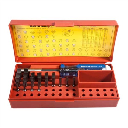 Every gunsmith knows no two screw slots are ever exactly the same. Because so many factories use outside vendors for screws, slot sizes can vary, even within the same model of gun. If you want to be professional about your work, you custom grind each bit to the correct size, a frustrating and time-consuming task without a Super Set. Magna-Tip Bits feature TRUE hollow-ground bits which transmit all the energy of torque evenly and smoothly, up the shank of the bit. Not only does hollow grinding permit this power transfer, it also gives complete metal-to-metal contact between the tip of the bit and the entire screw slot. Thus, maximum power can be exerted. The 22 Bit Starter Super Set eases you into the powerful Super-Set concept with the 22 straight bits: #120-3, #120-5, #150-4, #150-6, #180-3, #180-5, #210-4, #210-6, #240-3, #240-5, #240-7, #270-4, #270-6, #300-3, #300-5, #300-7, #340-4, #340-6, #340-8 ,#360-3, #360-5, #360-7. Your choice of one handle, and the heavy duty box, and tray. When you’re ready to expand your set, the Super Set Add-On Pak lets you upgrade it to the same configuration as the 44-bit Super Set.