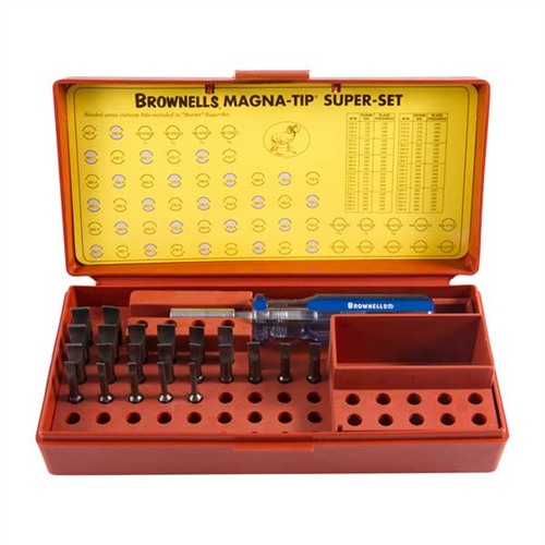Every gunsmith knows no two screw slots are ever exactly the same. Because so many factories use outside vendors for screws, slot sizes can vary, even within the same model of gun. If you want to be professional about your work, you custom grind each bit to the correct size, a frustrating and time-consuming task without a Super Set. Magna-Tip Bits feature TRUE hollow-ground bits which transmit all the energy of torque evenly and smoothly, up the shank of the bit. Not only does hollow grinding permit this power transfer, it also gives complete metal-to-metal contact between the tip of the bit and the entire screw slot. Thus, maximum power can be exerted. The 22 Bit Starter Super Set eases you into the powerful Super-Set concept with the 22 straight bits: #120-3, #120-5, #150-4, #150-6, #180-3, #180-5, #210-4, #210-6, #240-3, #240-5, #240-7, #270-4, #270-6, #300-3, #300-5, #300-7, #340-4, #340-6, #340-8 ,#360-3, #360-5, #360-7. Your choice of one handle, and the heavy duty box, and tray. When you’re ready to expand your set, the Super Set Add-On Pak lets you upgrade it to the same configuration as the 44-bit Super Set.