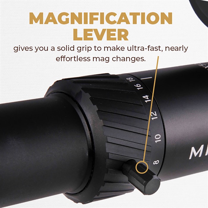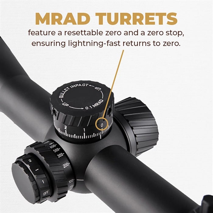 - Retícula y torretas en MRAD para ajustes rápidos y sencillos.