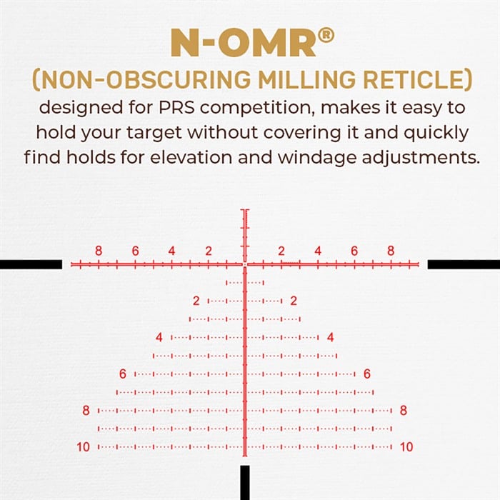 El Sistema N-OMR® (Sistema de Retícula de Fresado No Obstructivo®) tiene un centro abierto en la retícula principal que te permite apuntar a tu objetivo sin cubrirlo. Un beneficio adicional es que la delgada doble línea aumenta la visibilidad de la retícula a baja magnificación. Este tipo de retícula es excelente para disciplinas de tiro que requieren disparos rápidos bajo presión de tiempo, o cuando se necesitan seguimientos rápidos.