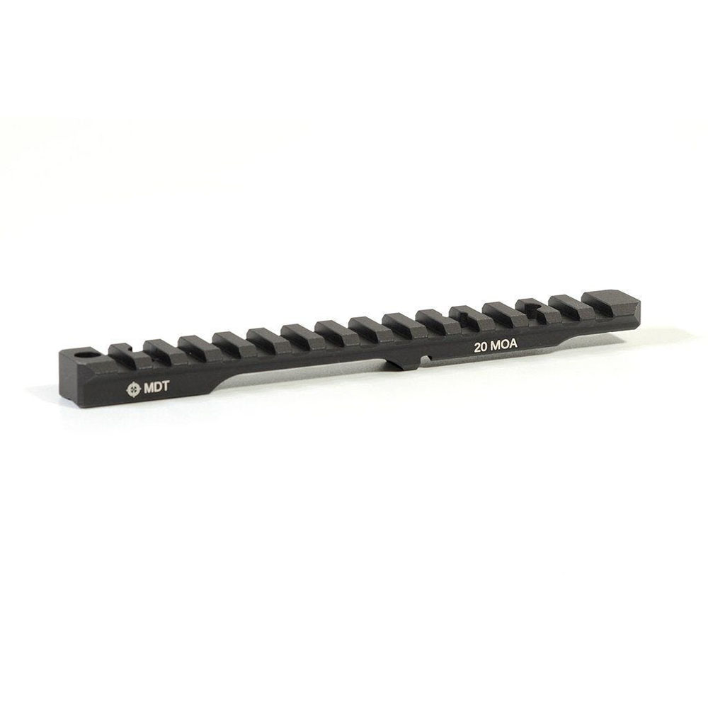 MDT’s Scope Base Picatinny Rails are designed to make the mounting of your optics easier. They are machined from 6061-T6 aluminum, then hard-anodized black for a durable finish. The underside of the rails are profiled to allow the rail to be mounted flush on the receiver and to match the geometry of the ejection port. These rails are designed with a 20 MOA incline providing additional elevation adjustment from your scope. A recoil lug has been integrated in the underside rail profile on models where the action’s design allows for this feature. Most bases work with left-handed actions, too.