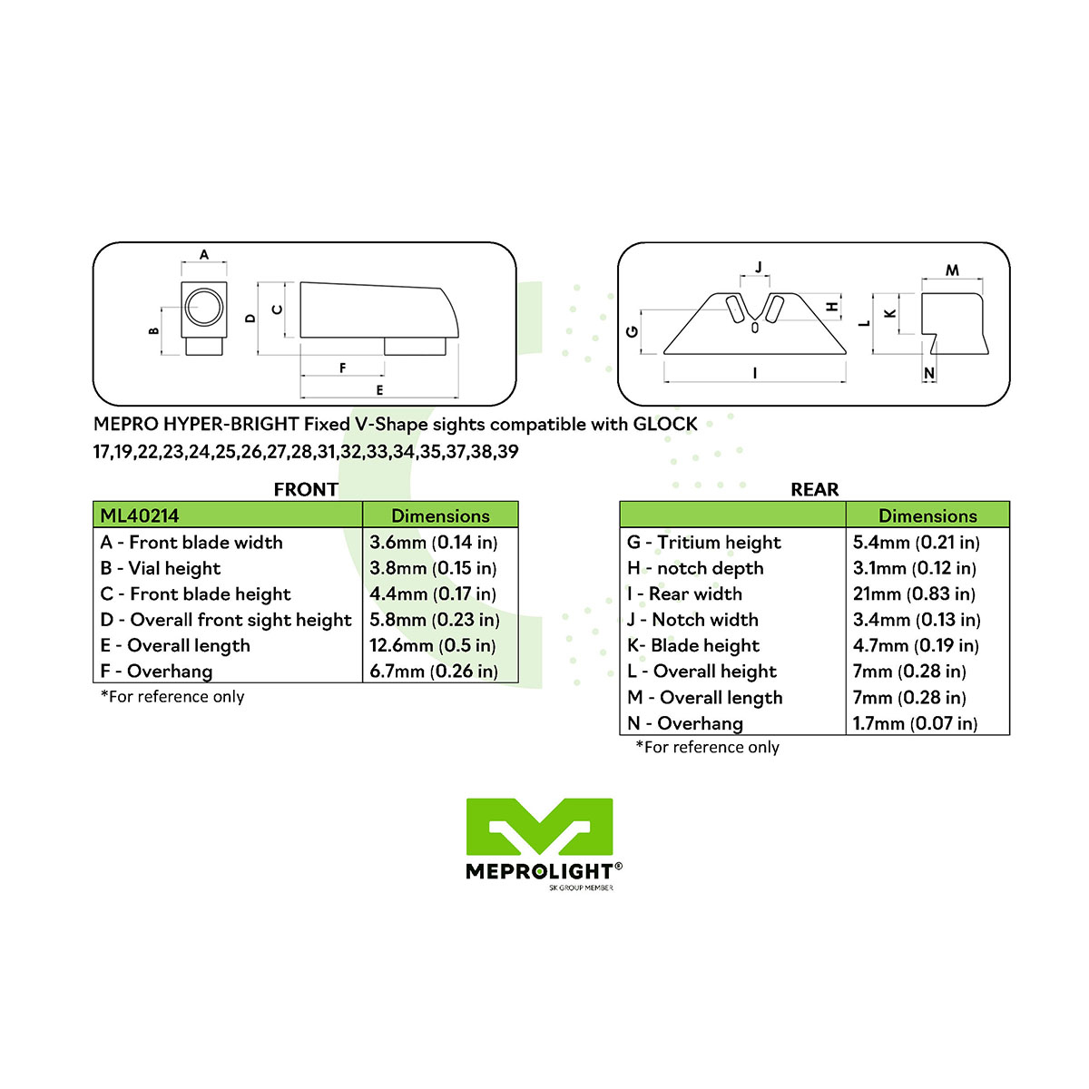 HYPER-BRIGHT CONCEPT: Mepro Hyper-Bright V-sights offer the most reliable illumination for day or night shooting. Mepro Hyper-Bright V sights feature an extremely bright contrasting colored ring on the front sight and V-shaped rear sight with two tritium vials and Yellow colored dot with radiant color that is charged by light and keeps glowing in lowlight conditions for a short time in conjunction with the tritium for fast and intuitive target acquisition.