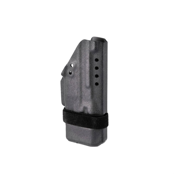 La retención es ajustable gracias a la innovadora envoltura de Velcro de 360 grados, que proporciona ajustes de retención extremadamente precisos y repetibles sin necesidad de herramientas. Esta retención de estilo "torniquete" ofrece un ajuste muy seguro mientras permite presentaciones excepcionalmente rápidas del arma desde el holster.