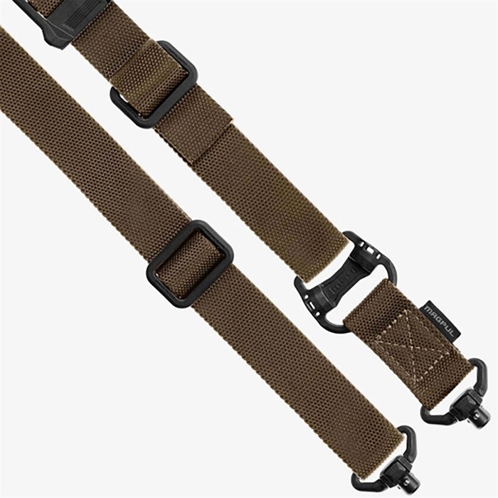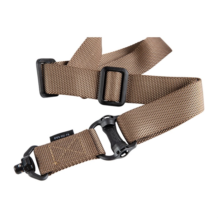 The Magpul MS4 QDM Sling is quickly reconfigurable between a one- and two-point operation, and enhanced by the factory-installed Magpul QDM quick-disconnect swivels! The Magpul QDM has a low-profile design and can be operated single-handily. The swivels are made with a corrosion resistant Melonite finish, and the included sling is 1-1/4” Proprietary weave wide nylon webbing that won’t rollover. This sling provides system strength, speed, and security with the use of Magpul QDM hardware, but maintains compatibility with the standard QD sling cup interface. The Magpul MS4 QDM Sling is made in the U.S.A. and is fully Berry Amendment compliant Secure and rapid length adjustment with MS1® Slider Freely rotating bale keeps from tails, loops, or other potential snag hazards Colored webbing has Near Infrared (NIR) treatment to reduce IR signature Available in black or coyote Based on the streamlined two-point MS1® Sling adjustment system, the Magpul MS4 QDM Sling retains the low-profile quick-adjust slider which minimizes bulk while allowing for effortless adjustment. The webbing length is optimized for a secure, yet comfortable fit with all body types and body armor setups.