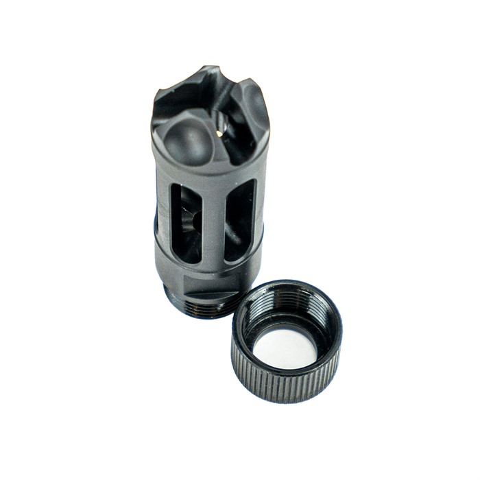Faxon's invented "MuzzLok" feature on this device allows for easy timing and installation of your device without the need for a crush washer or shims. By using the extension nut to adjust the length of the device, you can adjust the rotational timing. It is recommended that you tighten the device to the recommended torque specification of 20-25 foot pounds. By not having to overcome the resistance of the crush washer, this allows devices to be removed and reinstalled in the field if desired. FEATURES No crush washer needed. Attach and remove in the field. Time your muzzle device quickly and easily. SPECS Caliber: 5.56 .23 lbs 2.75" tall .875" in diameter Note: Cannot be shipped to CA