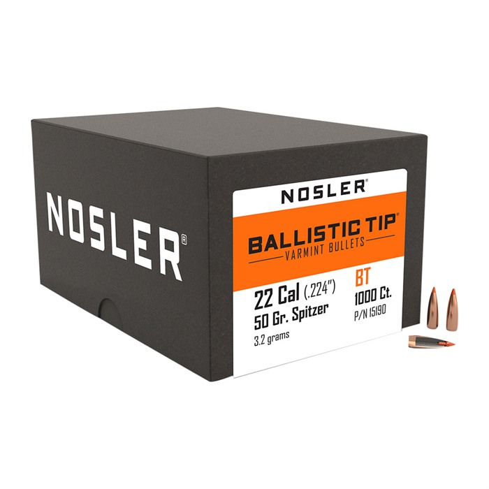 NOSLER BALLISTIC TIP HUNTING 22 CAL (0.224") BOAT TAIL RIFLE BULLETS Thriving on ultra-high velocity loads, the Ballistic Tip® Varmint bullet offers devastating performance at distances both near and far. The aerodynamic polymer tip (color coded by caliber) combined with the ultra-thin jacket mouth assures rapid and violent expansion at either end of the velocity scale. The bullet is equipped with a gradually thickening jacket wall that provides maximum energy transfer and optimum weight retention while the ballistically-engineered Solid Base® acts as a platform for large diameter mushrooms. No matter the rifle/cartridge combination you’re shooting or what varmint you’re shooting at, Nosler Ballistic Tip® delivers match-grade accuracy with all the performance characteristics serious varmint hunters are looking for. FEATURES: Polymer Tip Streamlined tip color coded by caliber. Ultra-Thin Jacket Mouth Assures violent expansion at either end of the velocity scale. Uniform Gradual Thickening The uniform, gradual thickening is designed to keep the bullet together until impact at any velocity. Ballistically Engineered Solid Base Boat tail configuration combines with the streamlined polymer tip for extreme long-range performance and easier loading.