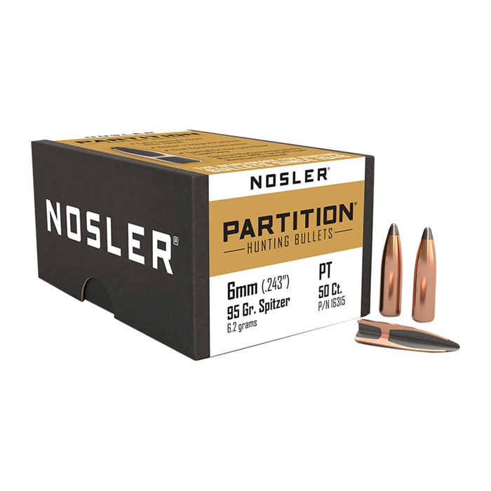 NOSLER® PARTITION 6MM (0.243”) FLAT BASE SPITZER RIFLE BULLETS The benchmark for hunting bullets since 1948, Nosler’s Partition® bullet is the cornerstone upon which the entire company was founded. The Nosler® Partition® front lead core is designed to expand and transfer massive shock and energy while the partition houses the rear lead core to maximize weight retention. The Nosler® Partition® delivers bone crushing energy, a massive wound channel, and deep penetration. FEATURES: Nosler Engineering Nosler's special lead-alloy, dual core provides superior mushrooming characteristics at virtually all impact velocities. Fully Tapered Copper-Alloy Jacket Ruptures instantly at the thin jacket mouth, yet the gradual thickening along the bullet’s axis controls expansion and curls the jacket uniformly outward at high and low velocities. Nosler's Integral Partition Supports the expanded mushroom and retains the rear lead-alloy core. The enclosed rear core retains more than two-thirds of the original bullet weight for deep penetration. Dual Core Construction Every Partition® bullet in the Nosler® line delivers optimum length, weight and ogive design for maximum in-flight and terminal performance. Special Crimp Locks Adds strength to resist deformation under the pressure of heavy magnums.