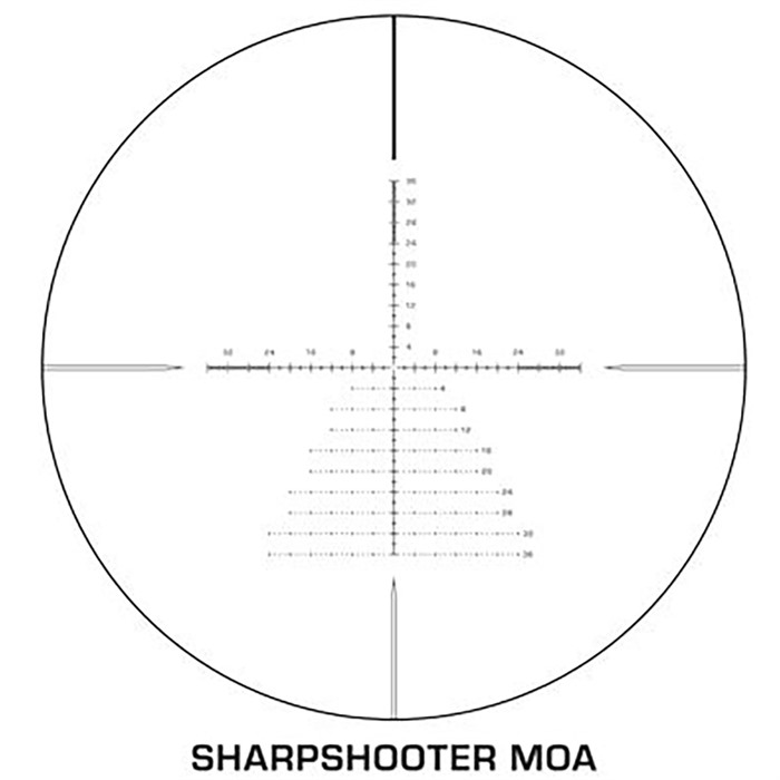 - Elección entre Sharpshooter MOA con ajustes de 0.25 MOA por clic, o Sharpshooter MRAD con ajustes de 0.01 MRAD por clic.