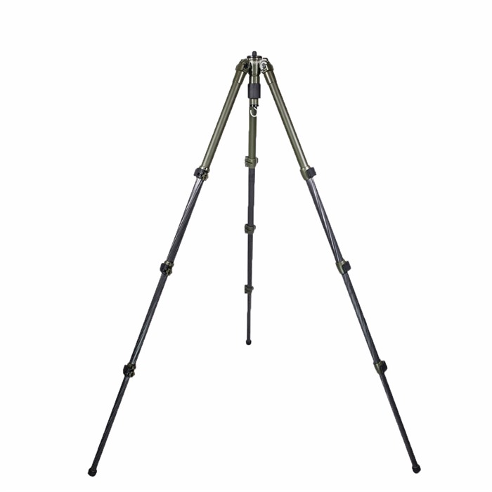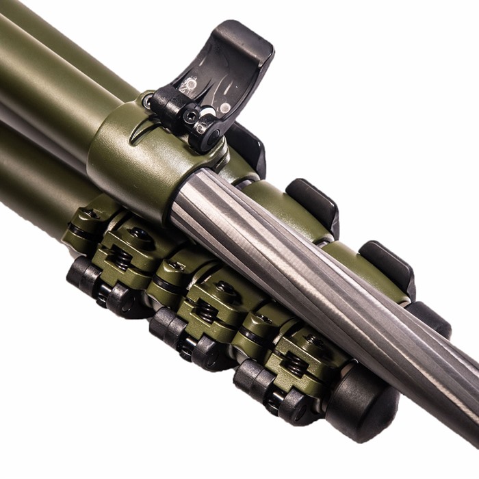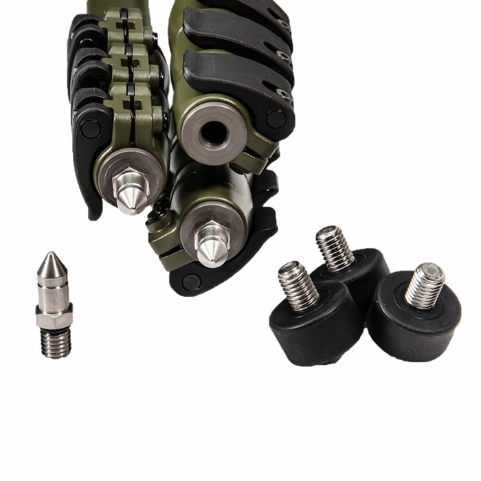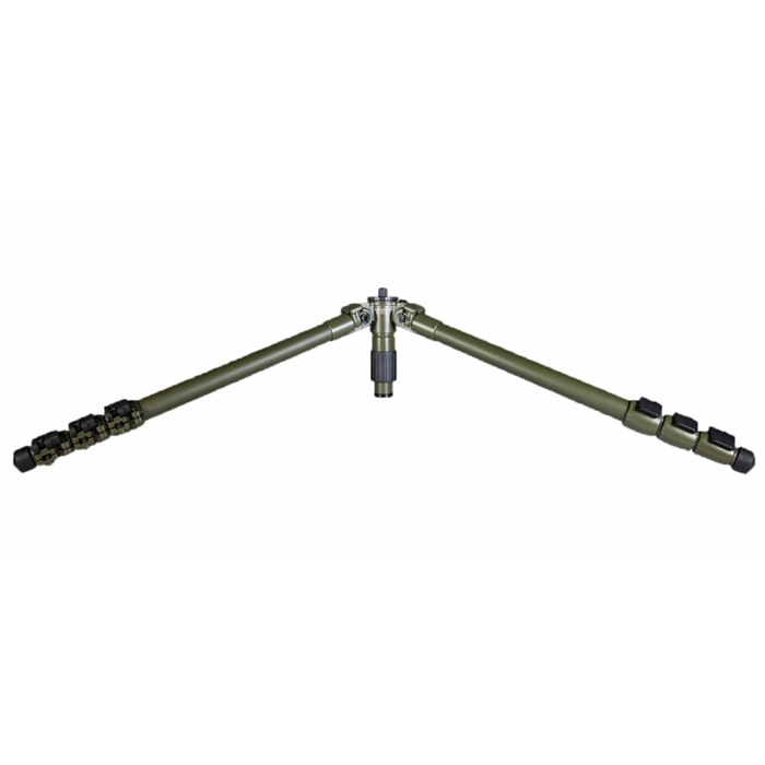 La columna central puede rotar completamente 365°, una gran característica para quienes planean montar directamente un PIG Saddle o HOG Saddle. Las patas del trípode incorporan pies de goma intercambiables o pies con puntas (los pies con puntas están incluidos). El PIGlite-CF4 tiene una capacidad de carga pesada de 24 lbs y está terminado en pintura verde OD mate.
