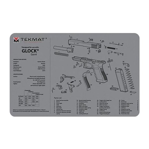 La TEKMAT PISTOL GUN CLEANING MAT para Glock Gen 4 en color gris es un tapete de limpieza de alta resistencia y flexible que cuida el acabado de tu pistola. Su parte superior cuenta con un detallado diagrama de piezas desglosadas de tu arma favorita.