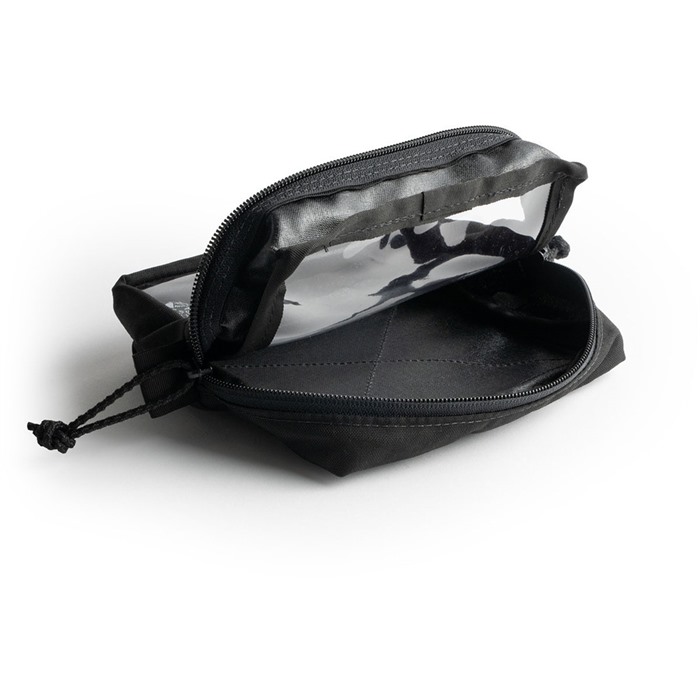 La parte trasera cuenta con un campo completo de hook, mientras que la parte frontal está hecha de vinilo transparente, lo que permite una fácil identificación del contenido de la pouch. Puedes colocar esta pouch en cualquier lugar, ¡incluso podrías decir que en cualquier sitio!