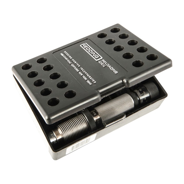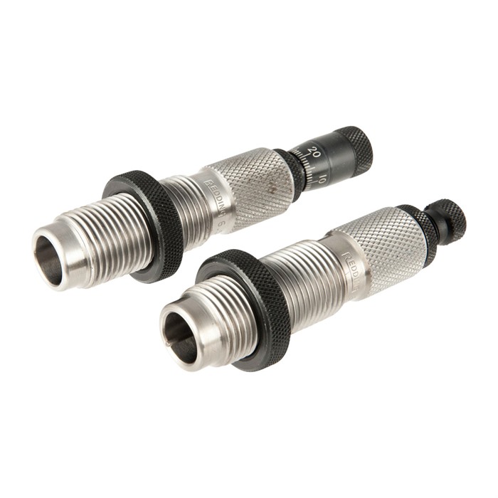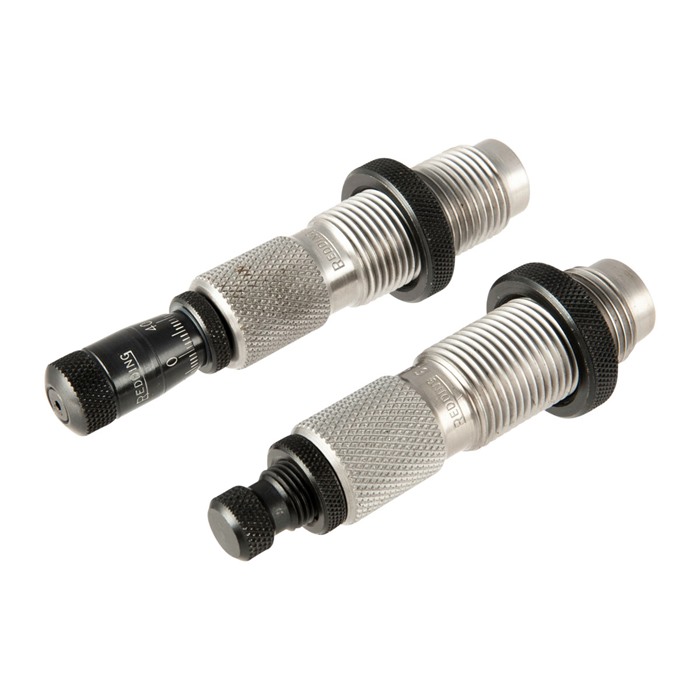 El set de dos (2) dies “Premium” de longitud completa contiene un botón de tamaño de carburo en el die de tamaño completo y el micrómetro de asiento de balas en el die de asiento.