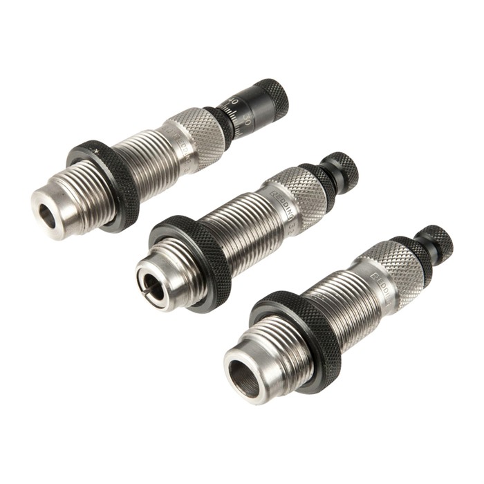 El Redding Premium Handgun 3-Die Set incluye un die de dimensionado de Carburo de Titanio, un die expander de diseño nuevo que contiene el exclusivo Redding expander plug, ahora recubierto con TiN (Nitruro de Titanio) para mayor dureza superficial, lubricidad y durabilidad. Este recubrimiento de TiN también reduce la acumulación de latón en el expander, una mejora importante para los recargadores de alto volumen.