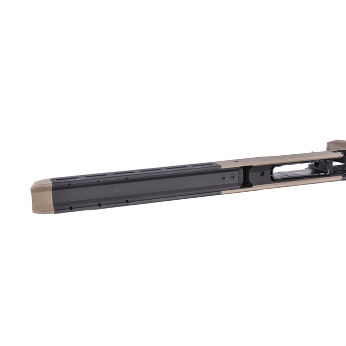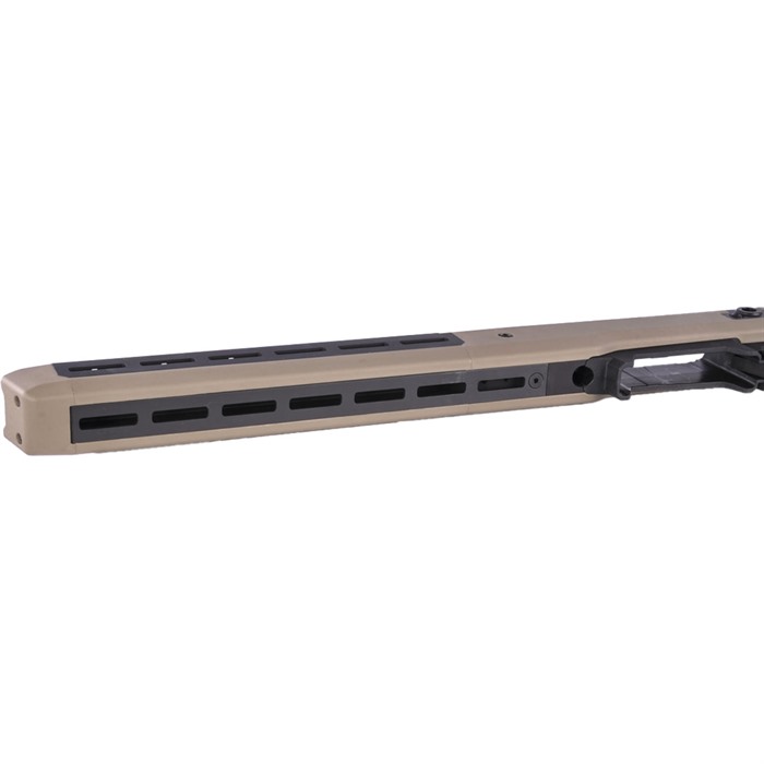 El pozo de cargador con patrón AICS presenta un liberador de cargador ambidiestro y tiene un tope frontal para evitar que el rifle descanse sobre el cargador al usar soporte de barricada. En la parte delantera, hay numerosos orificios M-LOK (izquierda-6 / derecha-6 / fondo-7) que te permiten montar cualquier accesorio que tu carga requiera.