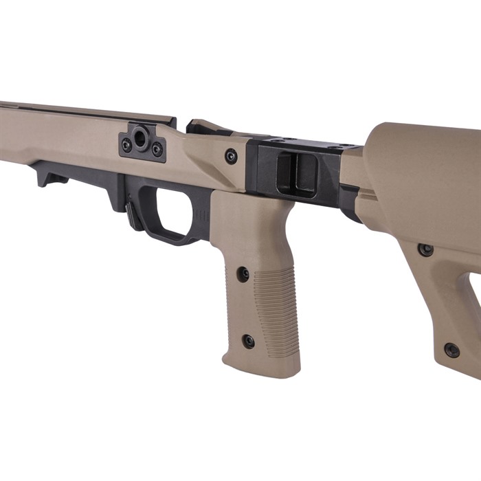 Maintaining the most important features of Magpul’s original Pro 700L, the Pro 700L Lite strikes a balance between features and cost without sacrificing performance. As the name suggests, the Pro 700L Lite blends the original Pro 700L Chassis and the PRS Lite stock to create a simplified rear end with a strong foundation – passing on the value and weight savings to you. The streamlined design weighs in at 4.5 pounds, a full pound less than its predecessor, but still packs a complete set of features that elevate your rifle’s performance. The Pro 700L Lite provides an optimized shooter interface with 0.8” of comb height and 1.4” of LOP adjustments (LOP measures 13.0” -14.4”). The low-profile rubber butt-pad is adjustable for height and cant, providing an extremely stable interface with the shooter’s shoulder. Sling attachment options include an ambidextrous 1.25” footman’s loop, a reversible QD sling swivel cup, and space for another optional QD sling swivel cup. The injection-molded polymer grip has a 5-degree forward edge sweep and enlarged palm swell with a 7-degree aft edge sweep for enhanced user comfort, and it includes a .75” fore/ aft adjustment range using a common hex wrench. An additional grip is included, offering a more aggressive sweep and enlarged palm swell for the shooter who is more inclined to a less vertical grip interface (8-degree forward / 20-degree aft edge sweep). The Pro 700L Lite surrounds its billet-aluminum chassis with Magpul polymer for enhanced ergonomics, strength, and sound mitigation. Built around the user, it is fully ambidextrous at the swap of a bolt retainer plate, and the vertical grip can be adjusted for various trigger reaches. The included large trigger guard can accommodate usage with gloves and aftermarket triggers. The AICS-pattern magazine well features an ambidextrous mag release and has a front barricade stop to prevent the rifle from resting on the magazine when using barricade support. Up front, there are numerous M-LOK slots (left-6 / right-6 / bottom-7) allowing you to mount whatever accessories your loadout calls for. Extremely versatile and adaptable, the Pro 700L Lite turns your long action, 700-pattern rifle into the perfect bolt action precision machine. FEATURES Fully machined aluminum fore end and bedding block AICS compatible bottom metal Vertical grip with adjustment for trigger reach Large trigger guard accommodates gloves and aftermarket triggers Compatible with left and right-handed actions Comb height, LOP, and butt pad adjustment from PRS Lite Injection-molded polymer grip with 5-degree forward edge sweep and enlarged palm swell with 7-degree aft edge sweep for enhanced user comfort combined with a .75” fore/aft adjustment range using a common hex wrench Additional grip option included with a more aggressive sweep and enlarged palm swell for the shooter that is more inclined to a less vertical grip interface (8 degree forward / 20-degree aft edge sweep) Multiple sling attachment points (an ambidextrous 1.25” footman’s loop, a reversible QD sling swivel cup, and a space for another optional QD sling swivel cup Made in the USA COMPATIBILITY Compatible with Remington® 700 Long Action and other Remington 700 Long Action footprints. Buttstock/cheek riser must be removed on the Pro 700L Lite before the user can remove the bolt from the action. Ships with MAG698 (Magnum Long Action AICS 5-round PMAG)
