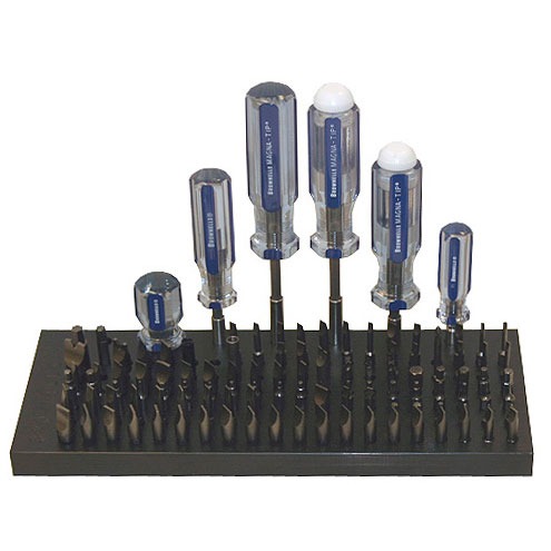 SPECS: Machined Delrin, tan. 12½” (31.8cm), 5-1⁄8" (13cm) wide, ¾” (1.9cm) high. Holds 120 Magna-Tip bits and 7 handles.
