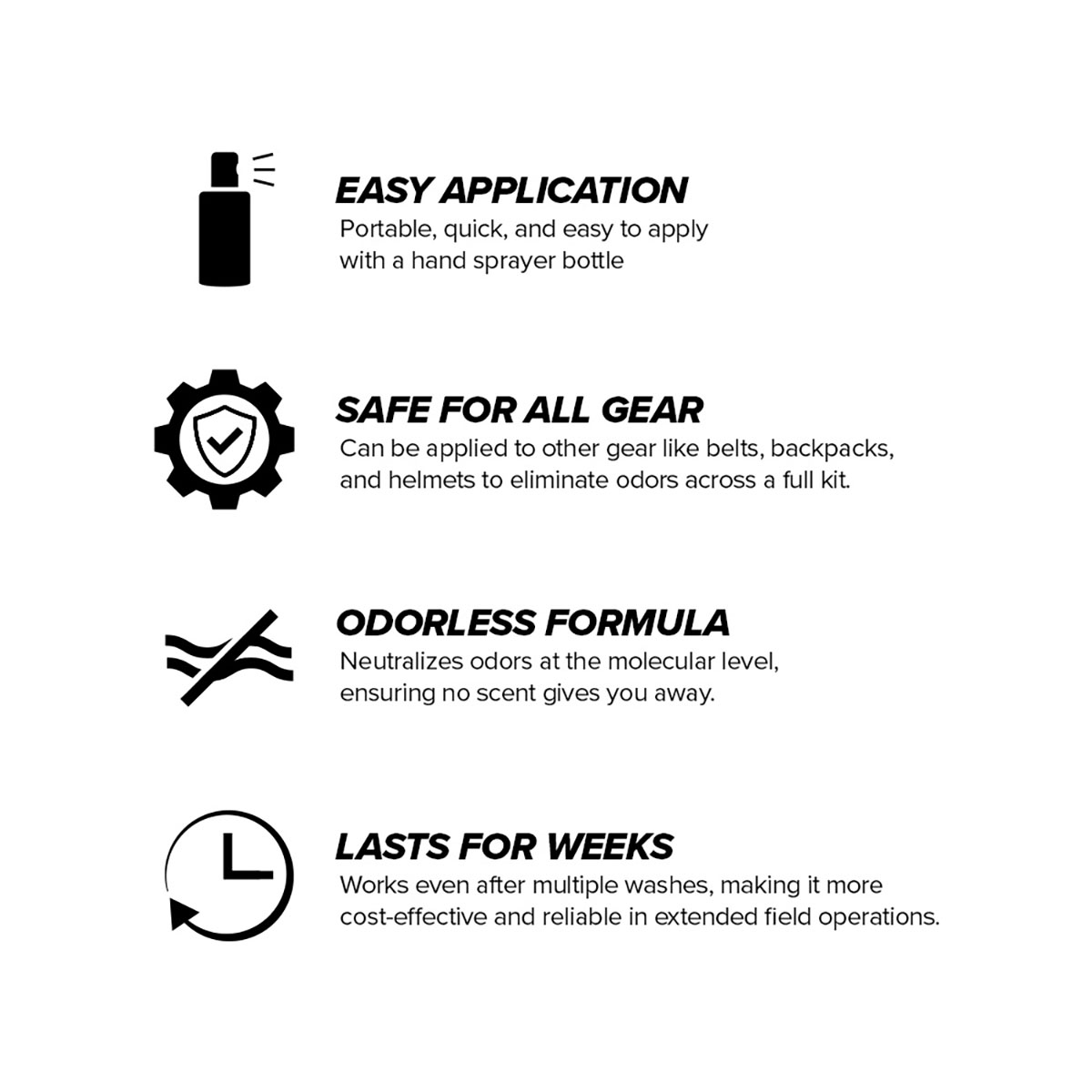 Diseñado para prendas que no se pueden lavar fácilmente, como chalecos, portaplacas y uniformes, Scent Purge proporciona un control de olores duradero sin dañar tu equipo. Mantente cómodo y limpio, sin importar cuánto dure el entrenamiento.