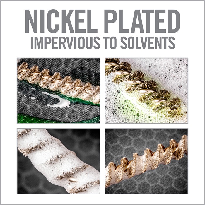 Las cerdas rígidas de bronce fosforado niquelado reducen la degradación química por los disolventes y extienden la vida útil del cepillo.
