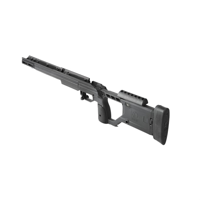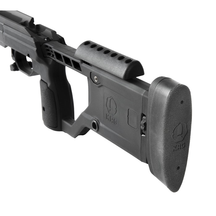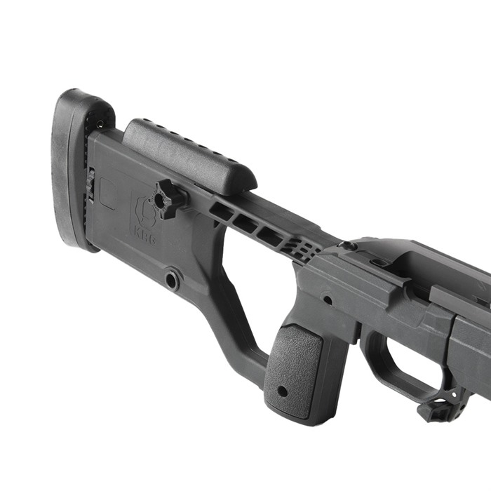 La novedad es un nuevo backend de una sola pieza, que viene de serie con ajuste de altura y ángulo del pad de culata sin herramientas, así como un tornillo de pulgar para la pieza de mejilla ambidiestra. Todos los chasis de KRG aceptan revistas AICS sin necesidad de nada extra; la revista no está incluida.