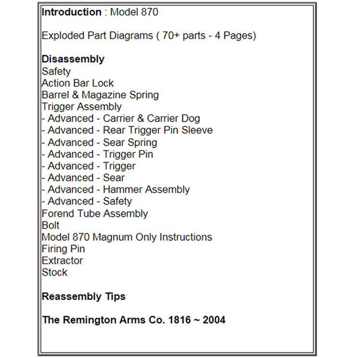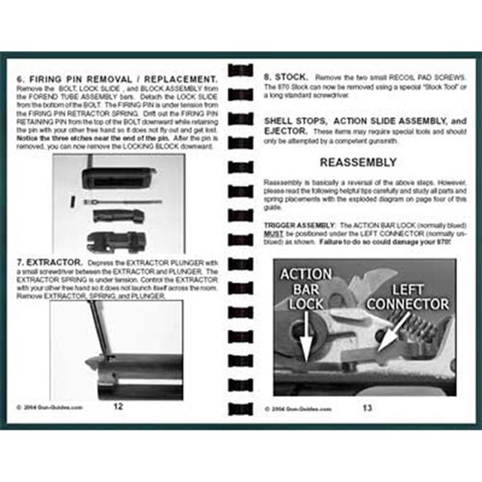 Undoubtedly, the Remington Model 870 shotgun is one of the world's most popular shotguns, with millions made and sold to consumers across America. Armed with the Remington 870 Assembly and Disassembly Guide, owners can get the inside scoop on these popular guns. Loaded with detailed schematics and step-by-step instructions, the Remington 870 Assembly and Disassembly Guide provides all the pieces of information needed to understand the mechanisms making up this design. Each instructional step is illustrated with detailed photos, ensuring readers are able to easily follow the guide. Printed on high-quality, bright, white paper Features durable cardstock cover Comb-binding lies flat on work surfaces Grayscale images Each Remington 870 Assembly and Disassembly Guide includes specialized tricks from the industry to keep your gun running trouble-free, and the guide also features unique information on specific models as well, where needed.