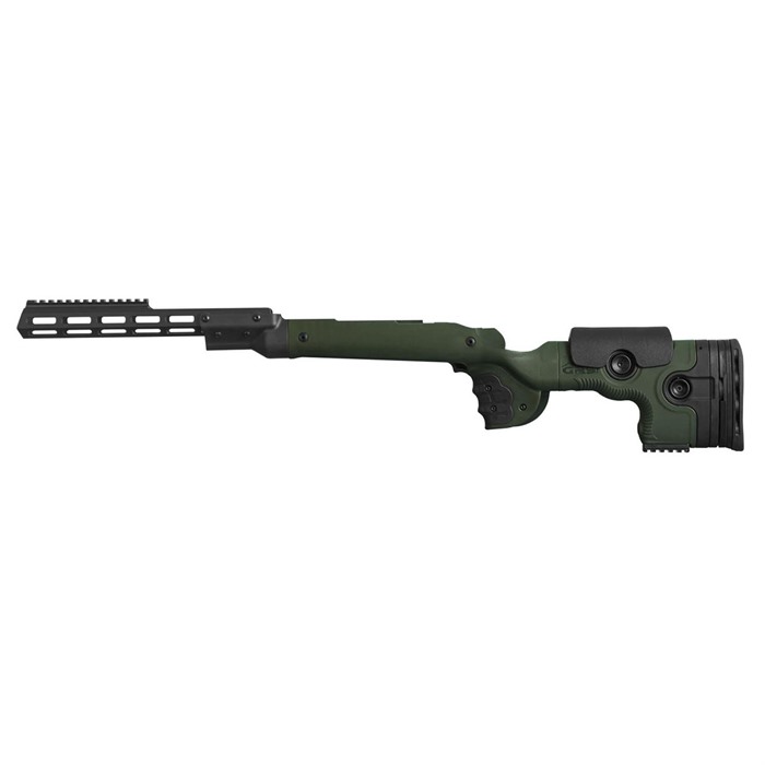The GRS Warg is a stock made for the long-range shooter - the shooters who use front mounted Night vision / thermal imaging equipment or top mounted bipods. GRS Warg has our ergonomic grip with an angle of six percent, so your hand is in its best natural state. And of course, the GRS unique SpeedLock 2.0 system that makes it easier to adjust the length and height of the stock, and, importantly, to resist recoil from the heaviest calibers. The ""AR"" style fore end is made for the M-LOK mounting system on accessories such as picatinny rails, sling studs, flush cups and so on. GRS Warg is available in the same inlets and colors as the Bifrost. 100% drop-in Fiberglass reinforced composite SpeedLock 2.0 adjustment system features 4-way adjustment; length of pull, comb height, recoil pad height, and recoil pad cant angle. LOP is from 13.2”-to 14.4” Revolutionary ergonomic grip, offset at six degrees, allows for extremely comfortable shooting M-Lok compatible aluminum forearm rail Uses factory bottom metal