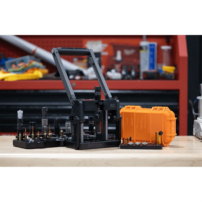 Cuando Short Action Customs se propuso desarrollar el Nexus Press, buscaban construir una prensa que eliminara cualquier problema asociado con la relación entre el dado y el soporte de cartucho. También querían desarrollar un sistema de acción de cam over más consistente y potente en cada ciclo de la prensa, así como un área de trabajo que te permita procesar tus casquillos de manera fácil y eficiente, sin los molestos brazos en C o pequeñas áreas de trabajo en tu camino.