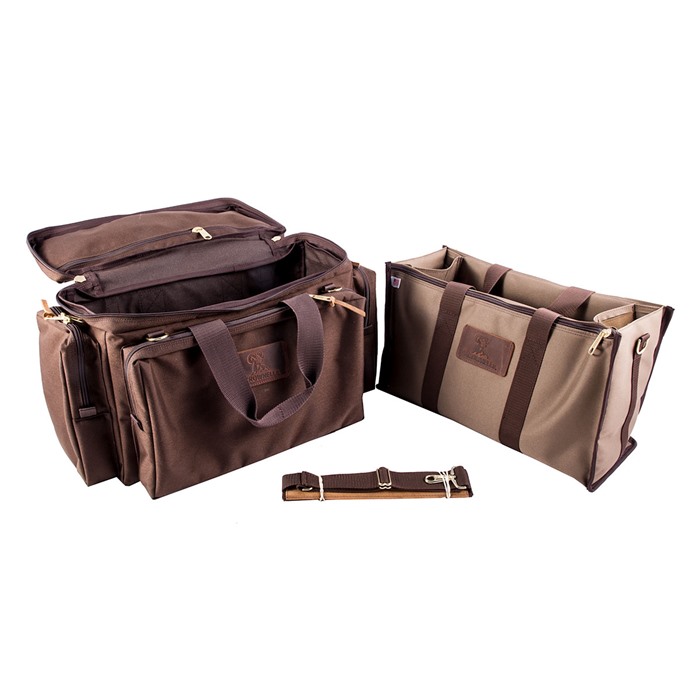We’ve taken the suggestions our customers have given us at the matches, those of competitive, pro-circuit, competition shooters, and added in the “gotta-haves” from the shooters on our own staff to come up with the best range bag we’ve ever seen. Designing such a bag was no easy task. And, we tossed around quite a collection of “good” prototypes before opening the red curtain on this work of art. In fact, we’re so proud of it, we had our logo branded in leather and sewn right on the front of the bag. Simply put…this is the bag, when only the best will do! We hand picked only the finest quality materials for minimal weight and maximum ruggedness, then selected a skilled supplier to provide the careful construction and attention to detail you’ve come to know and expect from Brownells. The Signature Series Range Bag is a versatile, two-in-one bag system featuring a roomy, outer bag with large exterior, bellow pockets and an inner, open bag with adjustable dividers, padded pistol inserts, magazine pouches and much, much more. Both bags are constructed of long lasting, 1000 denier, Cordura® nylon with non-scratching, self-healing, YKK zippers and solid brass pulls. We even added stylish, top-grain, leather straps to the zipper pulls where needed to make opening and closing the “high-use” compartments easier when wearing shooting gloves. Adjustable shoulder strap is made of strong, 1½" wide nylon webbing and includes a comfortable pad lined with non-slip, suede leather. Quickly detachable, brass-plated swivel clips are springloaded for extra security and allow shoulder strap to be interchanged between inner and outer bags. Inner bag provides safe transport for match pistols when you don’t want to leave them in your competition holster. Use the inner bag to carry just what you need to the firing line and for fast “bag-up” after shooting. If you have a lot of gear, use the bags separately for nearly twice the storage capacity. The double-layered, 3/8" thick, corrugated bottom panels in both bags give full support for heavy loads of ammunition, pistols, tools, sandbags and other shooting accessories while retaining the original shape of the bag. The Signature Series is a full-featured bag, designed to perform and built to last. Outer Bag: Moisture-resistant, 1000 denier, Cordura nylon Large, main compartment with zippered top, measures 18" long, 9" wide, 12" high Zippered, main, side pocket: 17" long, 2½" wide, 10" high. Holds shooting glasses, muffs, and cleaning supplies Two, padded end pockets 7" long, 2½" wide, 10" high provide ample room for choke tubes, spare parts, etc Two, flat, zippered pockets 18" long, 7" and 8" high for targets, notebooks, ballistic sheets, etc. Four, brass-plated D-rings provide lockable storage when used with your own padlocks Adjustable shoulder strap with polished, quick-release, swivel clips 2" wide, wrap-around carry handles with contoured grip area and hook and loop carry handle Self-healing zippers and solid brass, #9 zipper pulls Full 3/8" thick, bottom panel is composed of two, corrugated, double-wall, plastic sheets glued, then layered in opposite directions for superior strength and rigidity Inner Bag: 1000 denier, Cordura nylon with knit back, expanded vinyl lining for excellent water-resistance Two, fully padded pistol inserts and hook and loop closure straps fit inside the full-length, zippered side pockets for extra security. Accepts scoped, competition guns, spotting scopes, etc Two, removable, high-strength, plastic dividers with reinforced hook and loop edging for spacing adjustments; provides up to three individual compartments Brass-plated D-rings for shoulder strap attachment 3/8" thick, double-layered, bottom panel supports the heaviest gear Padded end panels for extra protection of inner bag contents Six, individually sewn, magazine pouches Self-healing zippers and solid brass, #9 zipper pulls Two, elastic, retaining straps for shooting towels, extra ammo and magazines