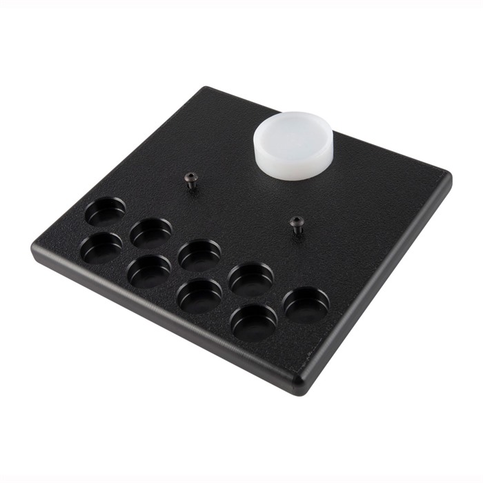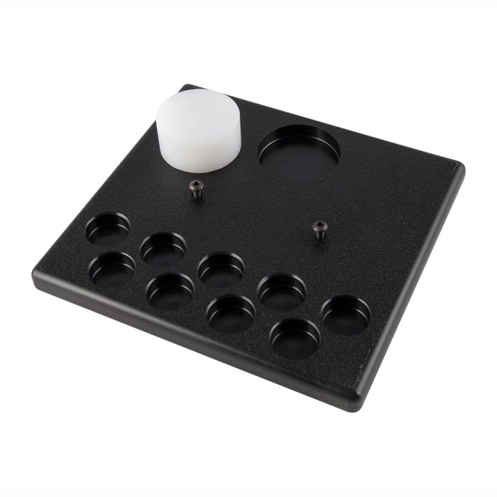 La idea para esta plataforma se originó de un escritor/cliente nuestro. La plataforma es una base de montaje para la serie de trimmers L.E. Wilson que proporciona espacio de almacenamiento para nueve (9) soportes de casquillos y un bloque de golpear para sacar los casquillos del soporte. La plataforma de polietileno tiene patas de goma, pero la mayoría de nosotros preferimos sujetarla con un c-clamp a la mesa.Pedido pendiente, tiempo de entrega aproximado 4-12 semanas desde el almacén de EE. UU.