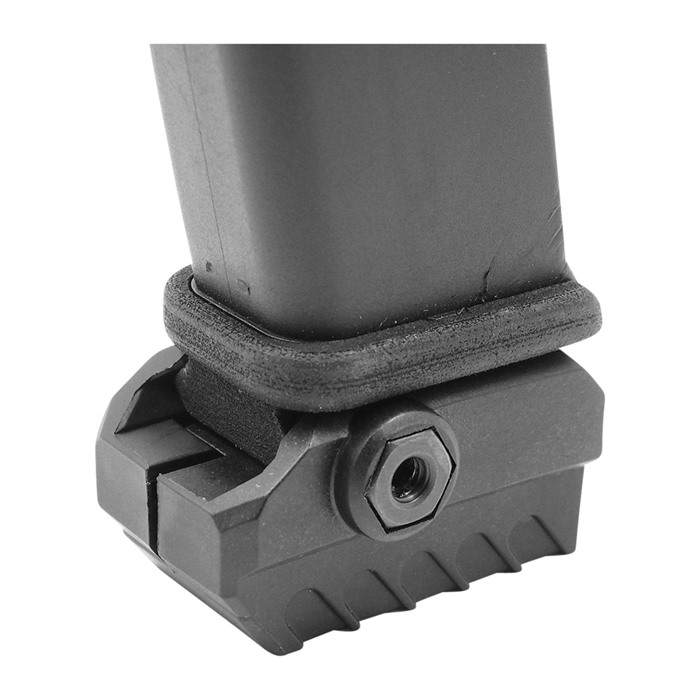 Un adaptador de riel Picatinny que se adhiere a la parte inferior de un plato de revista existente. Es preferible si no tienes una funda que acomode luces y deseas entrenar con extracciones de funda.