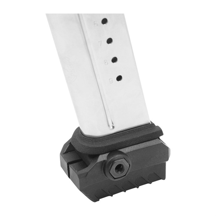 Este adaptador de riel Picatinny se adhiere a la parte inferior de una base de revista existente. Es preferible si no tienes una funda que acomode luces y deseas entrenar con extracciones de funda.