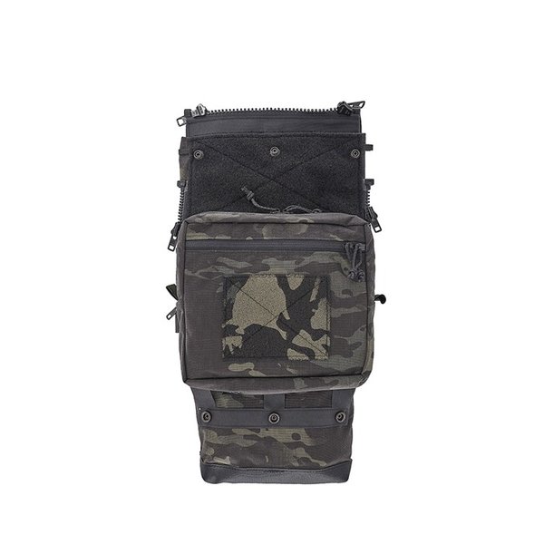 Utiliza los zippers superiores para adjuntar el panel a la bolsa de placa. Esto comprime el panel y permite llevarlo en una configuración "ligera", ideal para asaltantes que buscan un ajuste aerodinámico y solo necesitan llevar elementos como un pequeño bladder de hidratación, cargas de slap, granadas de destello y un kit GP en la espalda.