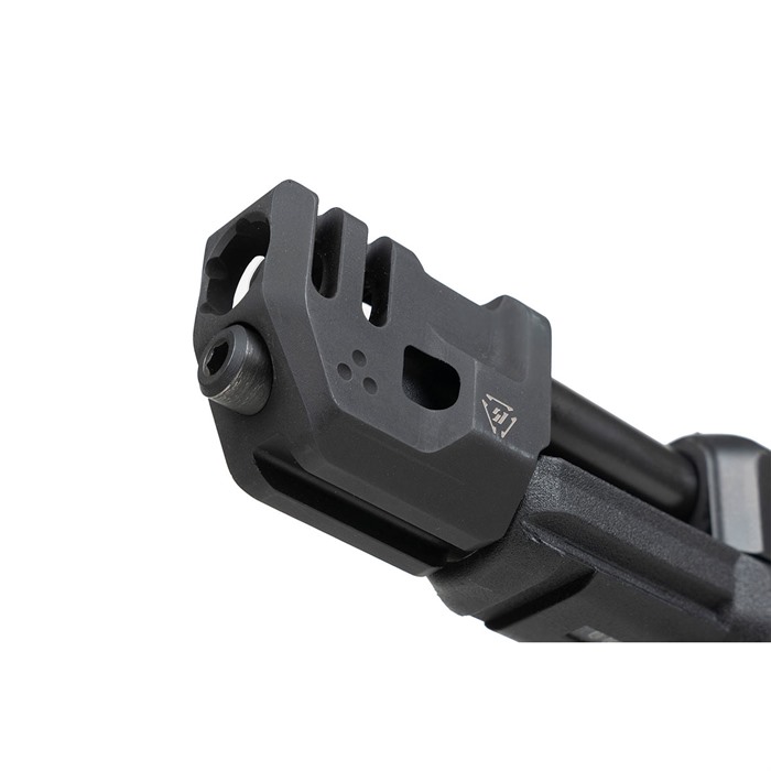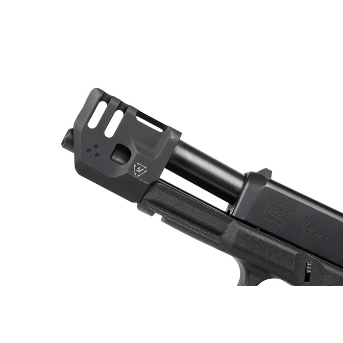 El compensador del sistema MDC tiene un diámetro ampliado para reducir los golpes de baffle y los disparos en forma de llave, junto con un corte de alivio de 2.5 mm en la parte superior trasera para reducir el "lipping" y el daño a la cara de la corredera de la pistola.