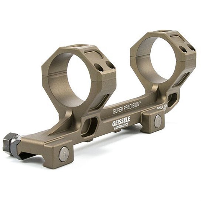 The Geissele AR-15/M4 Super Precision series of scope mounts are optimized for use with an AR-15/M4 upper. The mounting surface spans 7 picatinny sections and utilizes 4 shear lugs. These mounts use Geissele’s update of the classic nut and bolt method for clamping the mount to the picatinny rail, which is the most secure method of attaching your scope to your weapon. Each nut and bolt combination provides 1,400 pounds of clamping force, much more than any lever mounting arrangement. The Geissele Super Precision Mounts are available in 7075-T6 high strength aluminum. To create a mount with the best possible return to zero Geissele machines the entire mount from a single piece of billet aluminum. This allows them to add pockets and ribs throughout the mount for added strength and rigidity. It allows them to line bore the caps to each another and then serialize the caps to the body. The line bore operation creates the best possible fit to the body of your scope so that you can apply proper torque without fear of crushing or damaging the body of your scope. Another advantage of machining from a single piece of aluminum is that Geissele is able to create a mount with cap locations that will suit a wide variety of scopes. All mounts are available in zero and 20 MOA cant options, and in either black type 3 hard coat anodize or DDC (Desert Dirt Color) type 3 hard coat anodize.