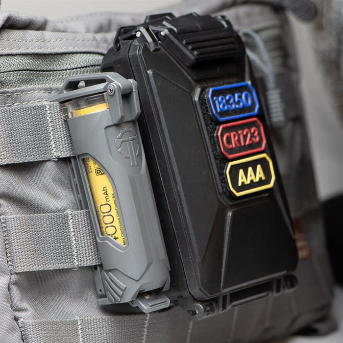 CELLVAULT-21 BATTERY STORAGE FOR 21700 AND STREAMLIGHT SL-B50 Protect your spare 21700 battery while keeping it immediately accessible with the CellVault-21 Rechargeable Battery Storage. Premium batteries require protection from physical and environmental damage but need to remain accessible to keep advanced tactical lights running at full power. The CellVault-21 Rechargeable Battery Storage provides the same feature set as our popular CellVault-18 including dual-wall construction & side viewing windows but adds a larger capacity and an upgraded latch that allows for easy installation, especially on tight MOLLE/PALS webbing. FEATURES: Holds one 21700 Rechargeable Battery Holds one Streamlight SL-B50 Battery (with foam removed) Waterproof O-ring seal rated to IPX7 at 2 meters for 30+ minutes Secure metal latch seals and attaches the CellVault-21 to gear Silicone foam shock absorber/noise silencer Clear side windows allow for gear status checks Slim profile: less than 1 MOLLE/PALS column wide for easy integration into existing gear configurations Detachable latch installs easily on all MOLLE and can be backed up with the included security pin Designed and manufactured in the USA INSTALLATION: Unlock the bottom latch and open the CellVault-21. Press the release tab with a screwdriver or similar tool to release the latch from the back strap. Insert the back strap through the MOLLE/PALS webbing. Align the side tabs and snap the latch back into the back strap. Install additional security pin through both the latch and back strap if necessary. Verify foam shock absorber is at the bottom of the CellVault-21 tube. Insert battery with the positive (+) terminal towards the foam at the bottom. Close the latch, making sure no material is caught in the tube/cap interface.