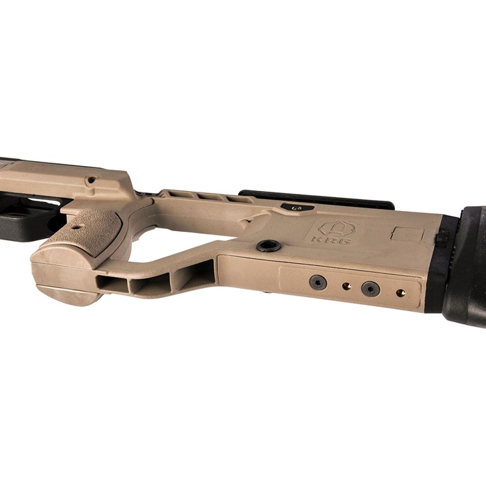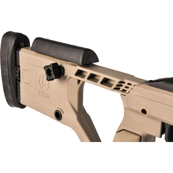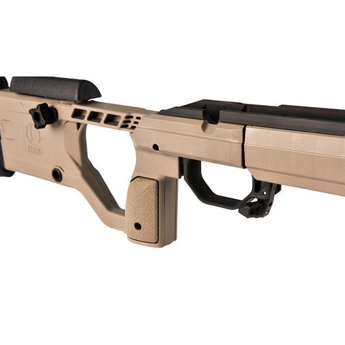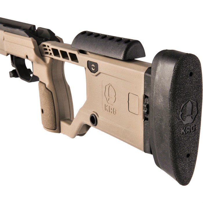 X-Ray Chassis (Generation 4) Unprecedented value...This is what the X-Ray chassis provides to you. When you pick up the X-Ray, it will feel nice and light compared to other chassis. You'll have nearly identical ergonomics to the Whiskey-3 with only a little more time involved in adjusting the different aspects like the length of pull. Furthermore, you'll have all the standard benefits of a chassis like the use of AICS magazines, a variety of mounting points for slings, barrier stops, etc., and aluminum block bedding for the action while not having to sell off a kidney to pay the price of admission. To accomplish Kinetic Research Group's design intent, they kept the features that everyone wants and needs and eliminated those that weren't necessary. Then they utilized efficient manufacturing processes to keep production costs down and in turn keep the price to the shooter down. The end result is a hybrid aluminum and polymer chassis that we think you'll love. KRG is proud to present the X-Ray chassis, the result of years of careful design, thought, refinement, and hard work. The change is a new one piece backend, which comes standard with tool-less buttpad height and cant adjustment, as well as a ambidextrous cheekpiece thumbscrew. The Tikka inlet accepts T3, T3x, and CTR versions, however slight mods may be required on the trigger-guard for the T3 TAC A1 to function properly. Tikka rifles accept AICS pattern mags with the exception of the Magpul AICS polymer mags.