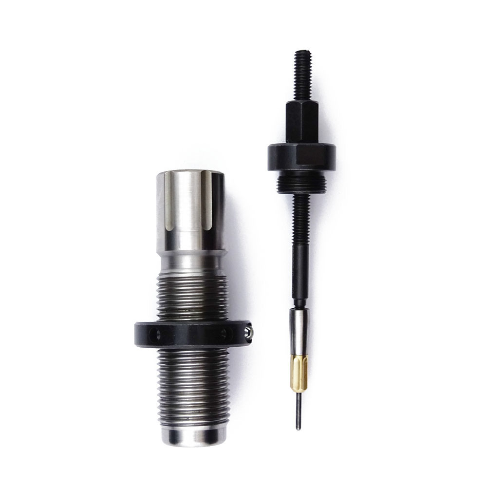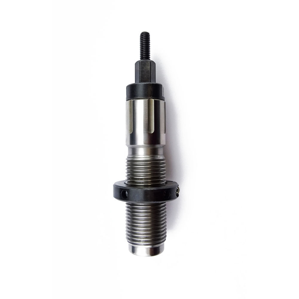 Este die FL cuenta con un expander desmontable y un pin expulsor de cebador integrado. Todos los ejes utilizados, el expander y el pin expulsor se pueden reemplazar fácilmente si es necesario, con poco esfuerzo. La calibración se realiza cuando la vaina del cartucho se introduce en el die. El cuello de la vaina se calibra desde el interior al salir del die, formando así la vaina y logrando una tensión correcta en el cuello.